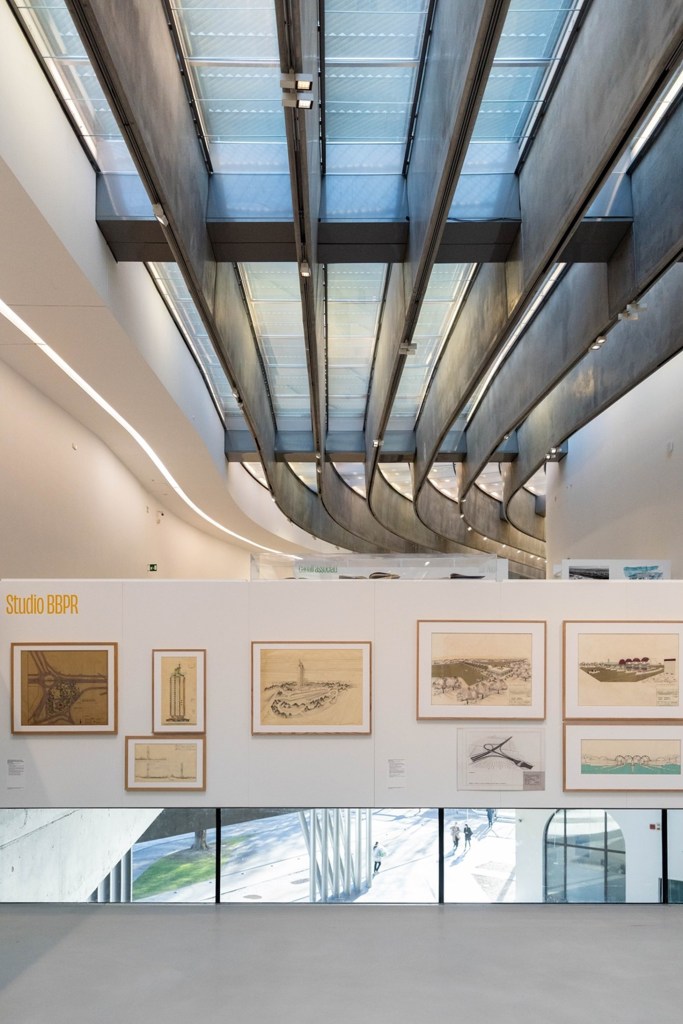 Tra i punti forti della mostra c’è la sezione dedicata ai progetti di Renzo Piano, tra cui il Ponte San Giorgio di Genova, un simbolo di rinascita dopo il crollo del Ponte Morandi. L’analogia tra i piloni del ponte e l’eleganza di una barca a vela evidenzia il connubio tra estetica e funzionalità. Non mancano visioni futuristiche come il concept per una stazione di servizio a copertura variabile, che sembra uscito da un film di fantascienza .